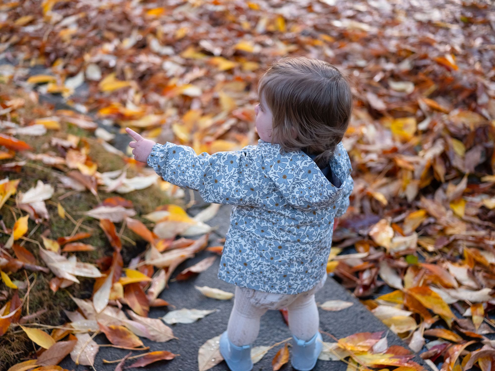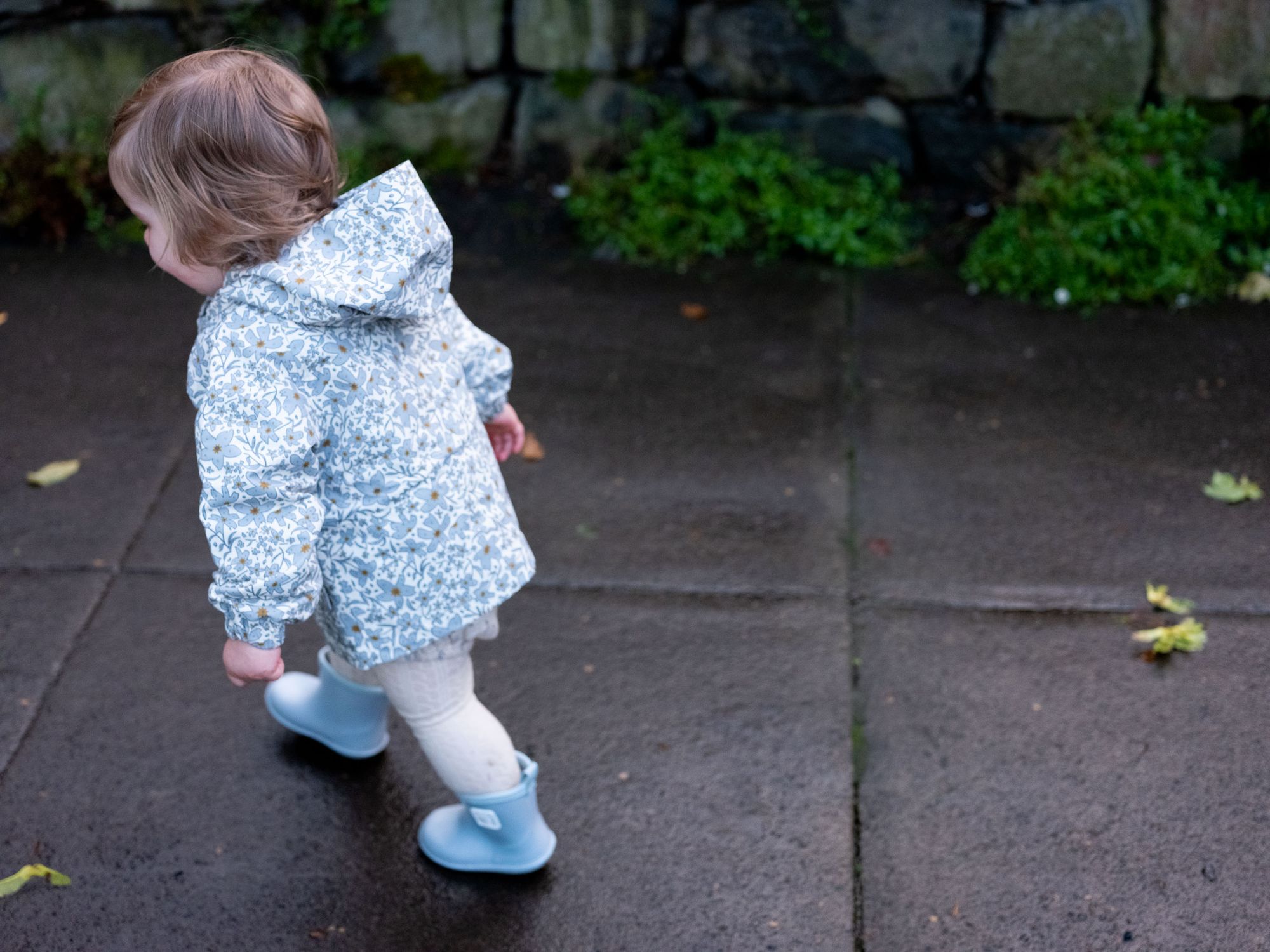 I brought the camera out on this walk because I wanted pictures of you, now. I want to always remember you in your tiny blue raincoat covered in flowers, your matching hair-clip, your smile, your big curious blue eyes. I’m writing this for the same reasons.