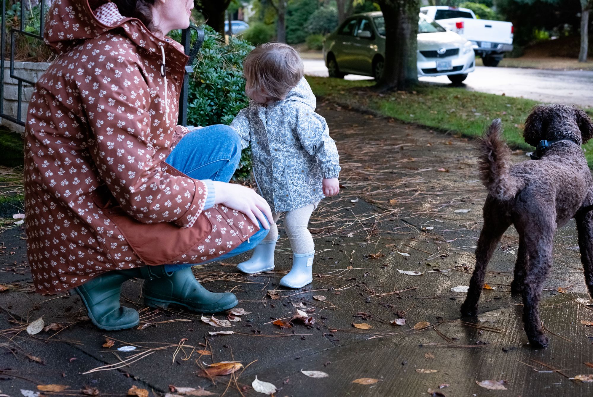 We walk home, your tiny arms stretched up to us. It’s fall and the rain is here and the dark falls early, it’s time to say good night to the puddles, the doggies, the bright orange leaves and the pumpkins of all sizes. They’ll be here tomorrow, waiting for you, and for years and years to come.