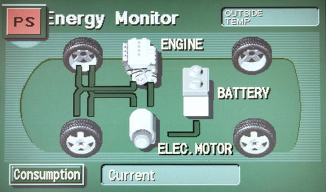 Priuses have a little TV in them that constantly show a bad ‘80s video game about managing nuclear power plant. There’s a diagram showing you which engine is in use (gas or electric), and how much recycled energy is being sent from the tires to the batteries.