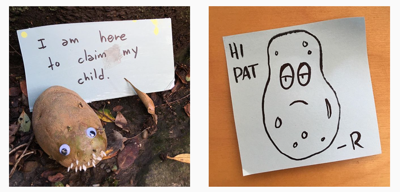 I came home to find a potato with googly eyes on my stoop, and I opened my mail to find a sticky note with a potato illustration.