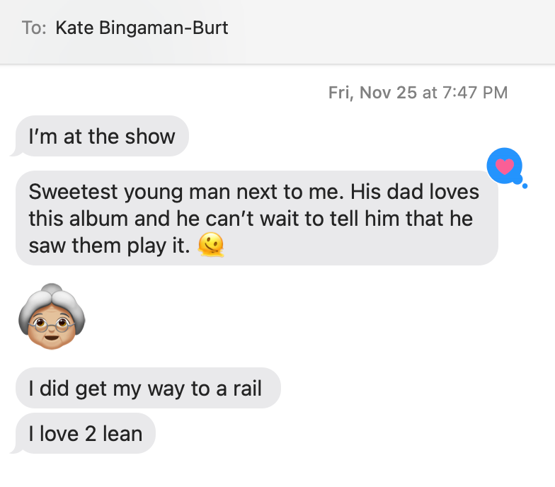 I loved getting texts from her at the show, and thought briefly, “Maybe I should have gone,” but my wife and I had just completed our nightly go-to-bed ritual of bath and books and bottle and I knew that’s where I was suppose to be, not at the show.